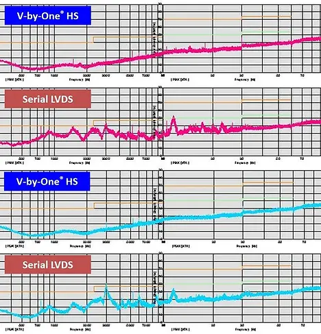 While LVDS reduces the number of lines from TTL/CMOS, both LVDS and TTL/CMOS have separate clock line (CLK) which is the cause of EMI. V-by-One® HS embeds CLK and with scrambling EMI is significantly reduced.