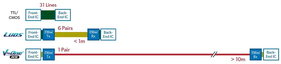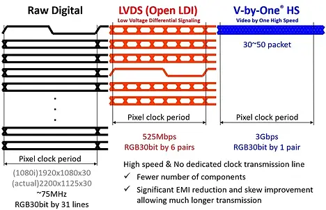 By serializing data and embedding CLK, the line count is significantly reduced. While LVDS serializes TTL/CMOS from 31 lines to 6 pairs, V-by-One® HS carries the same data by 1 pair, which by the way is the origin of “V-by-One” meaning Video by One pair.
