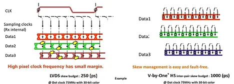 Also, by embedding CLK, any skew issues between CLK and data lines do no apply to V-by-One® HS. This relaxes PCB layout constraints as well as risks of video transmission malfunctioning in production.
